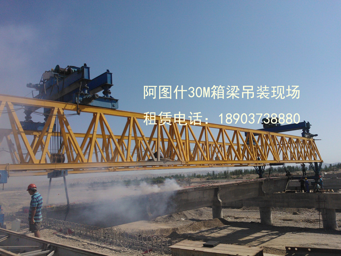新疆克州阿圖什帕米爾路博古孜河大橋30M箱梁吊裝現場,共計9跨81片30M箱梁。單片梁重110余噸,我單位采用40/160型架橋機進場架設。